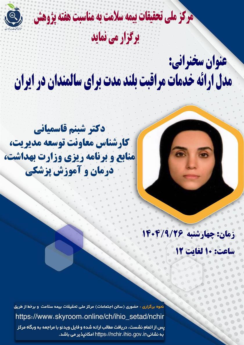 به اطلاع می رساند، مرکز ملی تحقیقات بیمه سلامت، در ادامه برنامه های بزرگداشت هفته پژوهش و فناوری، شصت و یکمین نشست علمی - تخصصی را با عنوان مدل ارائه خدمات مراقبت بلند مدت برای سالمندان در ایران برنامه ریزی نموده است.